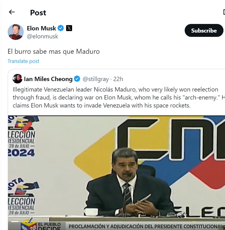 وفي إحدى تغريداته تعليقاً على تصريحات للرئيس الفنزويلي قال فيها إن ماسك يريد "احتلال فنزويلا بصواريخه الفضائية"، كتب الملياردير: "الحمار يعرف أكثر من مادورو".