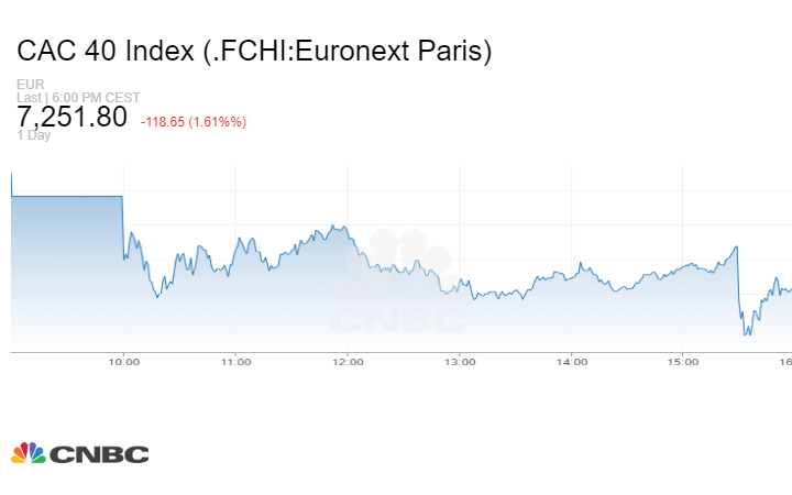 وانخفض مؤشر CAC 40 الفرنسي بنحو 118.65 نقطة أو بنسبة 1.61% عند الإغلاق إلى مستوى 7251.80 نقطة.