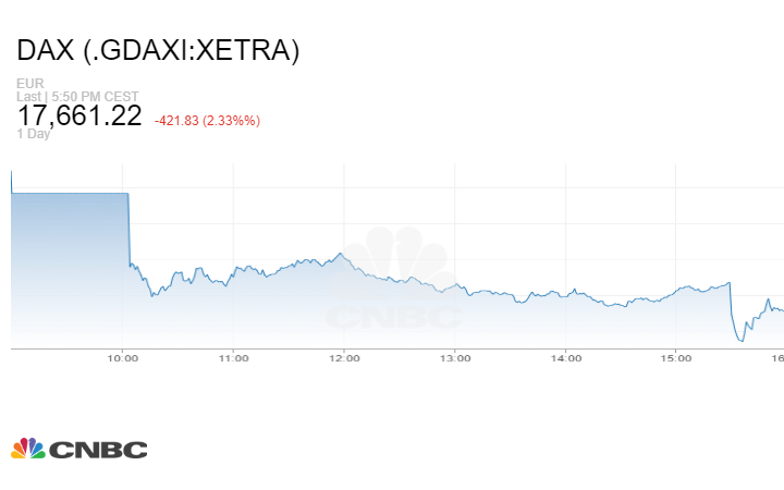 كما أغلق مؤشر DAX الألماني على تراجع 421.83 نقطة أو بنسبة 2.33% إلى مستوى 17661.22 نقطة.