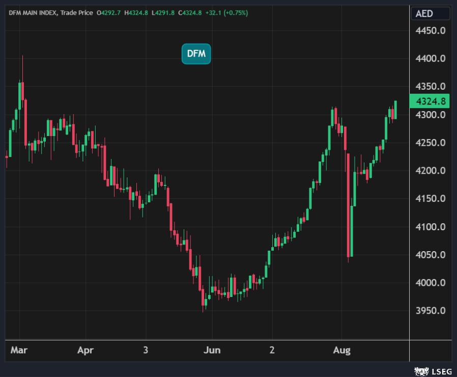 وارتفع مؤشر سوق دبي بنسبة 0.75% إلى أعلى مستوياته في 6 أشهر بدعم من ارتفاع سهمي إعمار العقارية وإعمار للتطوير بأكثر من 1.5% لكل منهما.