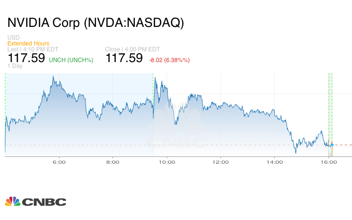 انخفضت أسهم إنفيديا بنسبة تصل إلى 8% في التداول بعد ساعات العمل قبل أن تتعافى معظم هذا الانخفاض. وكانت آخر مرة منخفضة بنحو 2%.