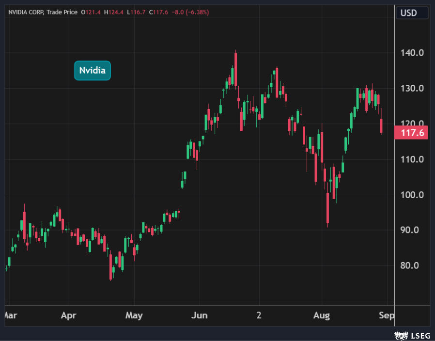 تراجع سهم Nvidia بأكثر من 6% في جلسة الخميس لتخسر الشركة 197 مليار دولار من قيمتها السوقية في يوم واحد وتهبط إلى ما دون 3 تريليونات دولار لتتراجع إلى المركز الثالث عالمياً بعد Apple و Microsoft.