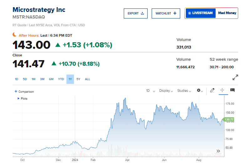 ارتفعت أسهم شركة MicroStrategy بأكثر من 8% يوم الجمعة 14 سبتمبر/أيلول، بعد أن أعلن مؤسسها مايكل سيلور عن شراء الشركة 1.1 مليار دولار أخرى من عملة البيتكوين.