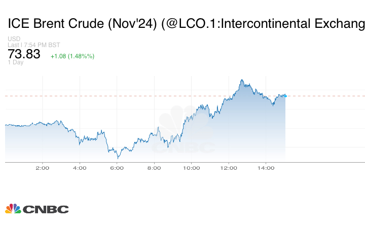 ارتفعت العقود الآجلة لخام برنت 95 سنتاً أو 1.31% إلى 73.70 دولار للبرميل عند التسوية.