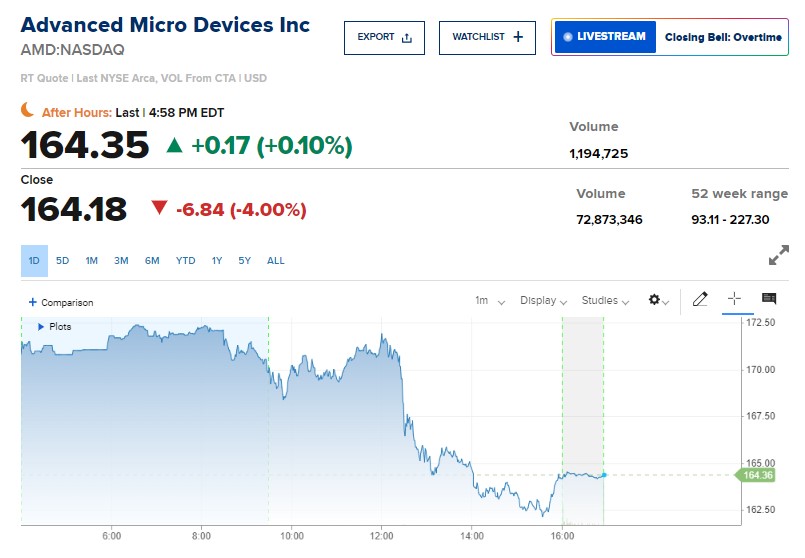 انخفضت أسهم شركة Advanced Micro Devices بنحو 4% في تعاملات يوم الخميس، حتى بعد أن أعلنت الشركة عن رقائق ذكاء اصطناعي جديدة.