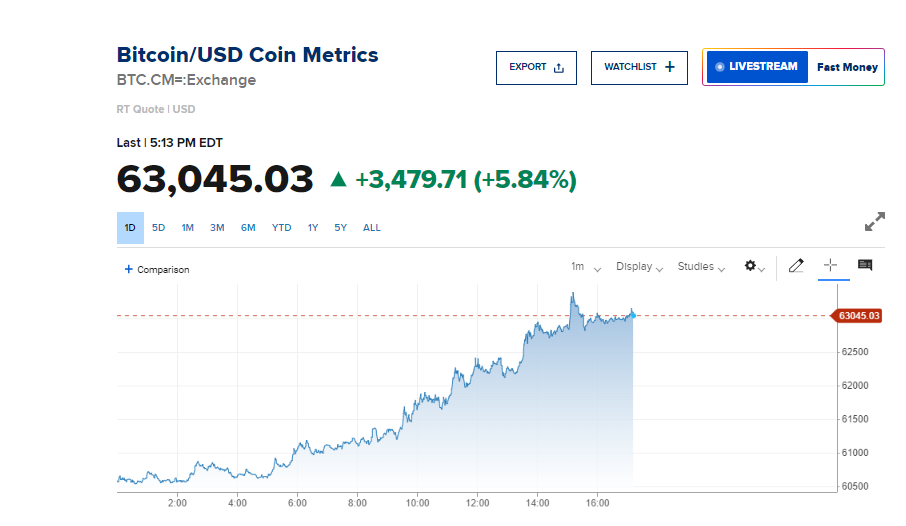 وبلغ سعر البيتكوين 63.045 ألف دولار في وقت كتابة هذا التقرير، بارتفاع قدره 5.8%، وهو أكبر مكسب يومي منذ أواخر أغسطس/آب.