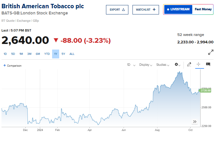 هبطت أسهم شركة بريتيش أميركان توباكو بنسبة 3.5% يوم الجمعة.