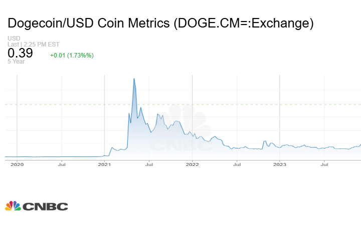 ارتفعت قيمة عملة دوجكوين بنسبة 24.6% يوم الثلاثاء إلى ما يقرب من 0.44 دولار وبنحو 10% يوم الأربعاء إلى أكثر من 0.42 دولار اعتباراً من حوالي الساعة 10:25 صباحًا بتوقيت شرق الولايات المتحدة، متجاوزة بذلك علامة 0.40 دولار لأول مرة خلال أكثر من 3 سنوات. لكن العملة فقدت بعض المكاسب لتصل إلى حدود 0.39 دولار في الوقت الحالي.
