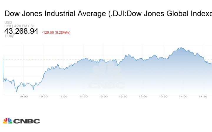 انخفض مؤشر Dow Jones الصناعي 120.66 نقطة أو بنسبة 0.28% عند إغلاق تعاملات الثلاثاء إلى 43268.94 نقطة.