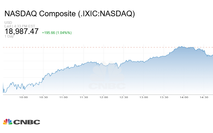 وارتفع مؤشر Nasdaq المركب عند الإغلاق بنحو 195.66 نقطة أو بنسبة 1.04% إلى 18987.47 نقطة.