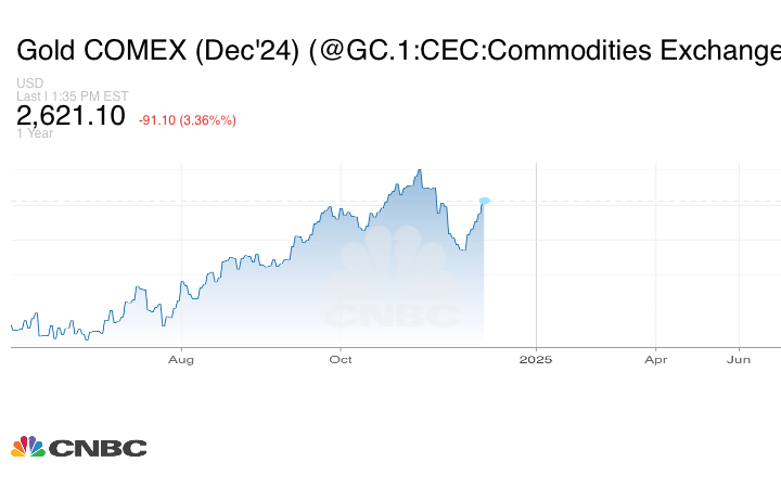 وانخفض السعر الفوري للذهب نحو 3.4% إلى 2619.66 دولار للأونصة، وهو أكبر انخفاض يومي بالنسبة المئوية منذ 6 نوفمبر/تشرين الثاني. ونزلت العقود الأميركية الآجلة للذهب 3.5% إلى 2618.50 دولاراً.