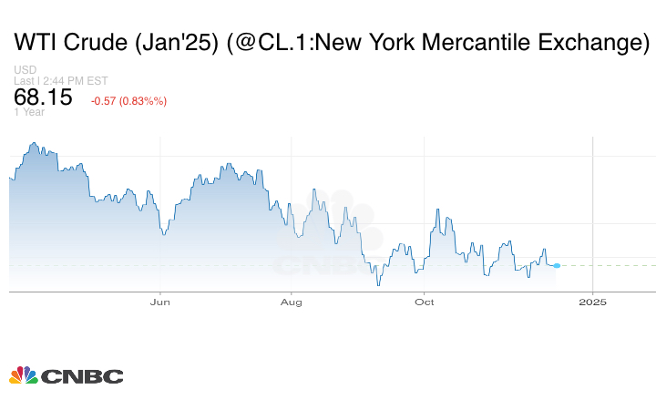 كذلك، انخفضت العقود الآجلة لخام غرب تكساس الوسيط الأميركي 72 سنتاً أو 1.05% لتبلغ عند التسوية 68 دولار.