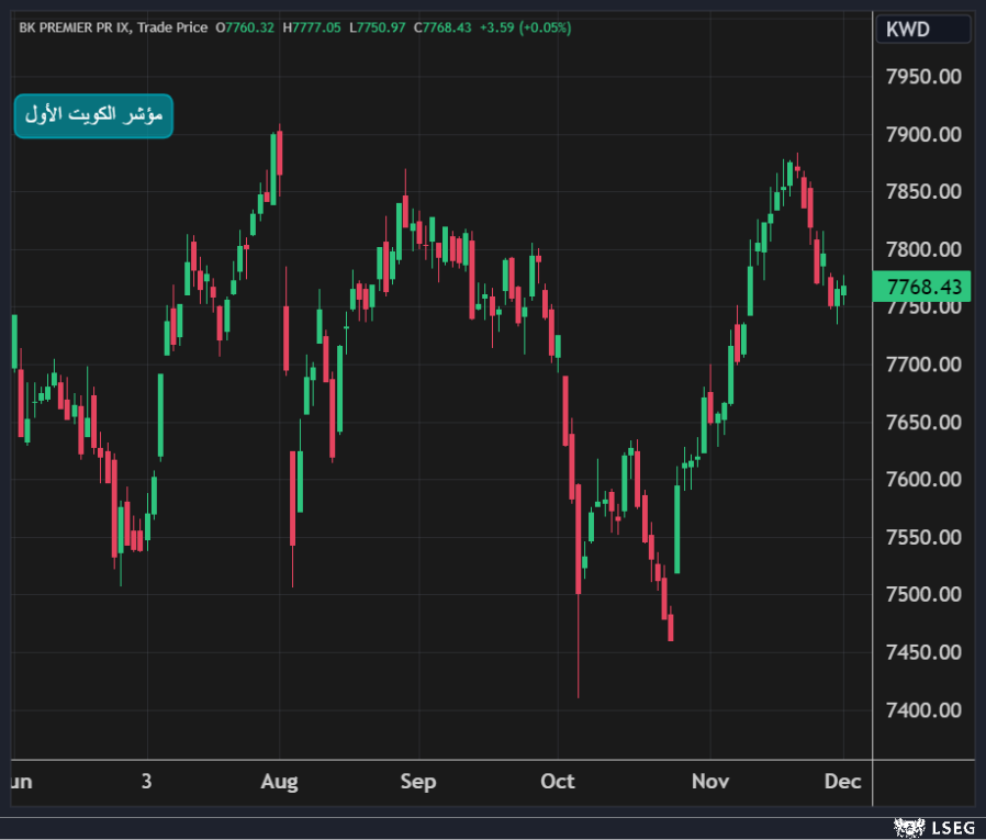 أغلق مؤشر الكويت الأول مستقراً دون تغيير عند مستويات 7768 نقطة في جلسة الإثنين وسط تباين في أداء القياديات مع ارتفاع سهم بنك الكويت الوطني بنسبة 0.1% مقابل انخفاض سهم بيتك 0.4%.