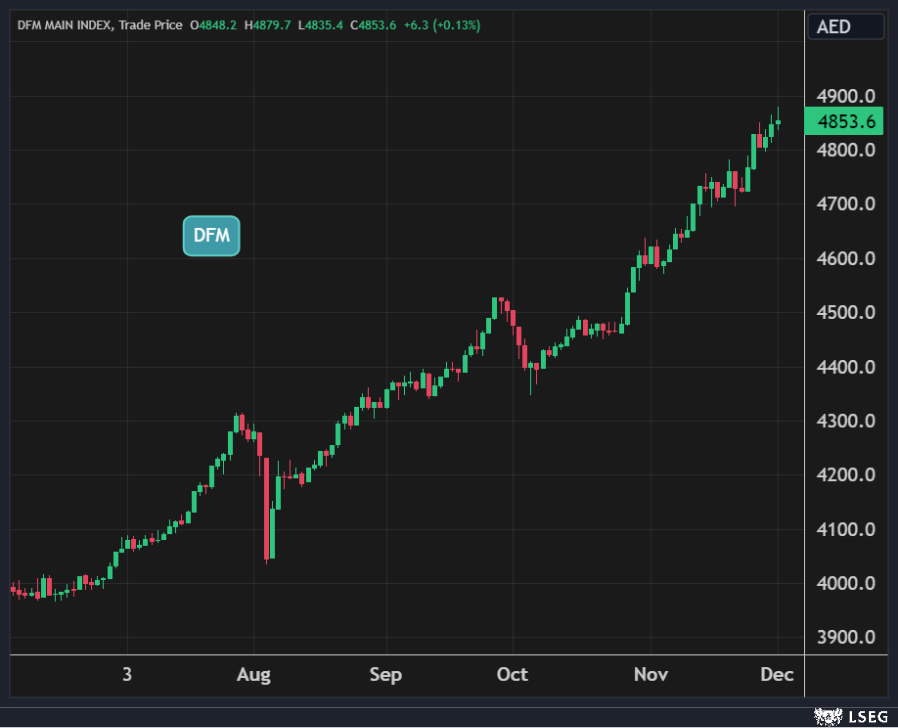كما واصل مؤشر سوق دبي مكاسب بعد عطلة استمرت يومين ليرتفع بنسبة 0.1% في جلسة الأربعاء مسجلاً ثالث مكاسب يومية على التوالي ليغلق فوق مستويات 4850 نقطة لأول مرة في 10 سنوات.