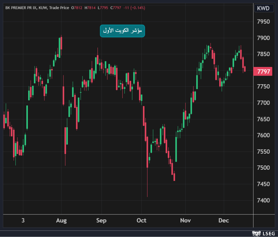 تراجع مؤشر الكويت الأول بنسبة 0.1% في جلسة الثلاثاء مسجلاً ثالث خسارة يومية على التوالي بضغط من انخفاض سهمي أرزان وبيتك بنسبة 1.2% و0.1% على التوالي.