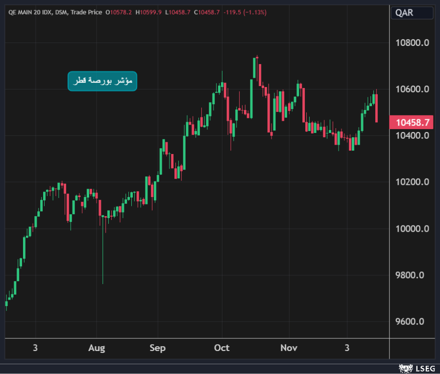 تراجع مؤشر بورصة قطر بنسبة 1.1% في جلسة الثلاثاء مسجلاً أكبر خسارة يومية في 5 أسابيع لينهي سلسلة ارتفاعات استمرت لـ 6 جلسات متتالية بضغط من انخفاض سهمي صناعات قطر ومصرف قطر الإسلامي بنسبة 2.7% و1.1% على التوالي.