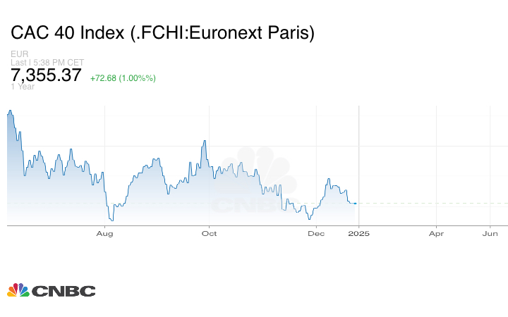 وزاد مؤشر CAC 40 الفرنسي بنسبة 1.00% عند الإغلاق إلى مستوى 7.355.37 نقطة.