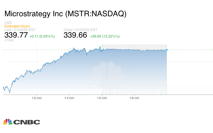 سجلت شركة MicroStrategy، عملاق البتكوين، ارتفاعاً بنسبة 13.22%، حيث ارتفعت بمقدار 39.65 دولاراً لتغلق عند 339.66 دولاراً.