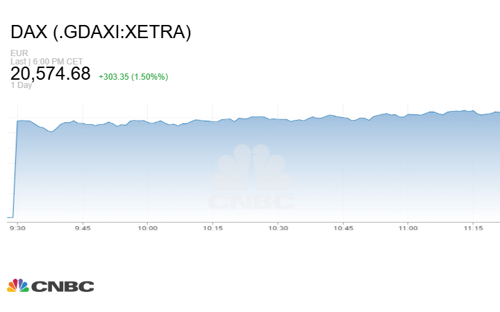 كما أغلق مؤشر DAX الألماني الجلسة على ارتفاع 303.35 نقطة أو بنسبة 1.50% إلى مستوى 20574.68 نقطة.