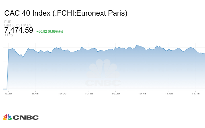 وارتفع مؤشر CAC 40 الفرنسي بنحو 50.92 نقطة أو بنسبة 0.69% عند الإغلاق إلى مستوى 7474.59 نقطة.