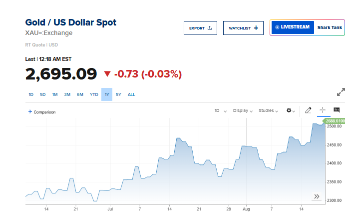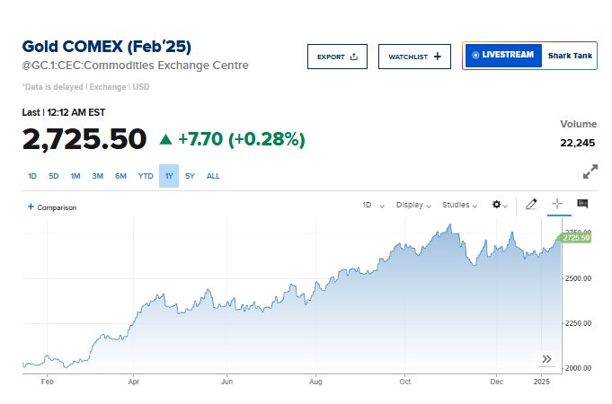 وارتفعت العقود الآجلة للذهب في الولايات المتحدة بنسبة 0.28% لتصل إلى 2725.50 دولاراً.