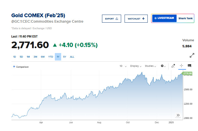 وارتفعت العقود الآجلة للذهب بنسبة 0.15% إلى 2771.60 دولاراً.