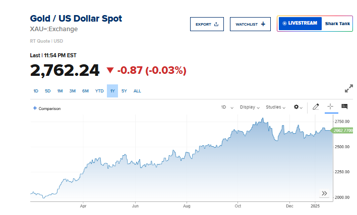 تراجعت أسعار الذهب في المعاملات الفورية بنحو 0.03% إلى 2,762.24 دولاراً للأونصة.