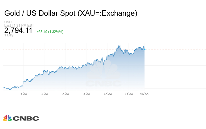 صعدت أسعار الذهب في المعاملات الفورية بنحو 1.4% إلى 2794.11 دولار للأونصة في الساعة 18:30 بتوقيت غرينتش، وذلك بعد تسجيلها أعلى مستوى على الإطلاق عند 2798.24 دولار في وقت سابق من التعاملات.