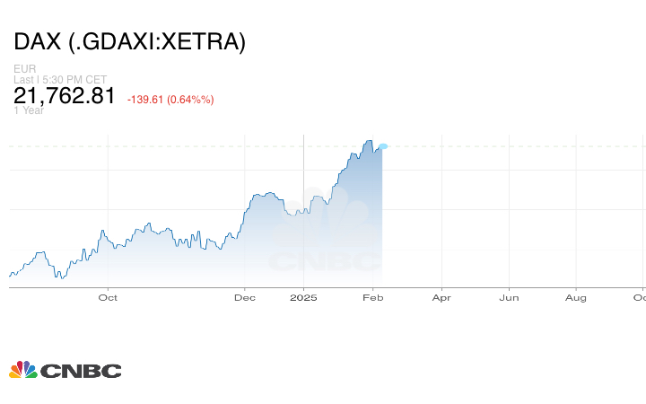 أغلق مؤشر DAX الألماني الجلسة على تراجع 139.61 نقطة أو بنسبة 0.64% إلى مستوى 21,762.81 نقطة.