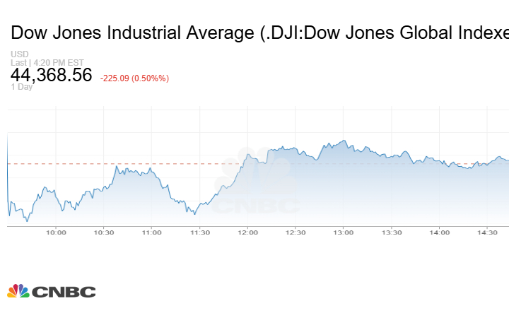 انخفض مؤشر Dow Jones الصناعي 225 نقطة، أو 0.5%. وتراجع مؤشر S&P 500 بنسبة 0.3%، بينما ارتفع مؤشر Nasdaq المركب بنسبة 0.03%.