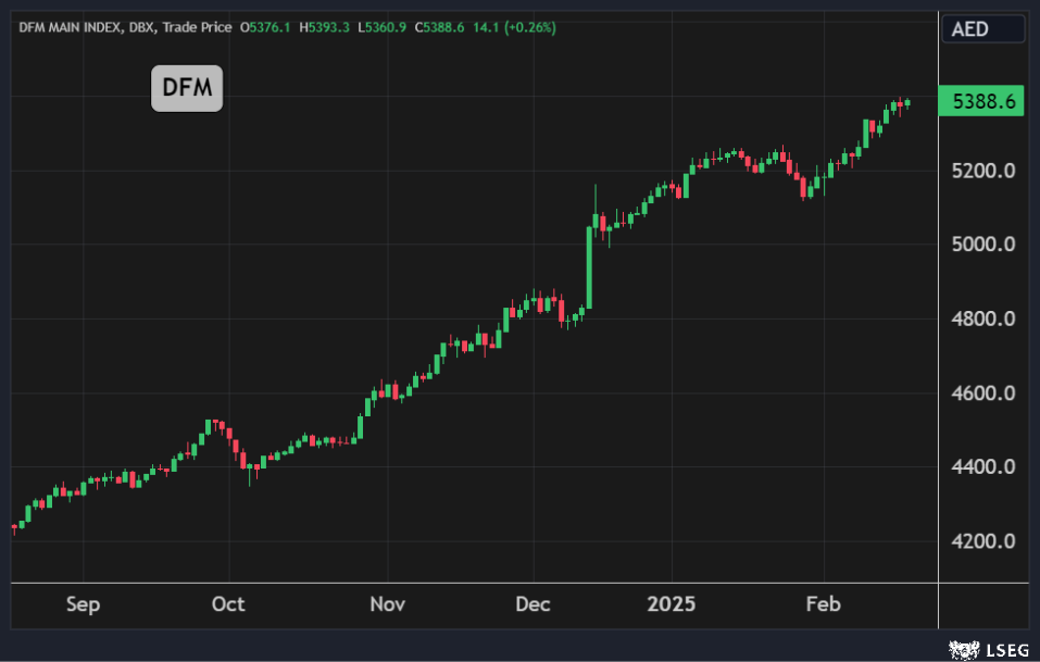 في حين ارتفع مؤشر سوق دبي بنسبة 0.3% مسجلاً أعلى إغلاق يومي في 16 عاماً بدعم من ارتفاع سهم إعمار العقارية بنسبة 1.1% مسجلاً أعلى إغلاق له منذ عام 2006.