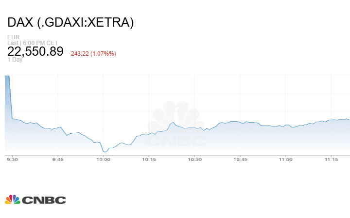 وأغلق مؤشر DAX الألماني الجلسة على انخفاض 243.22 نقطة أو بنسبة 1.07% إلى مستوى 22550.89 نقطة.