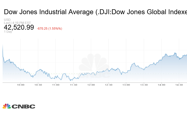 انخفض مؤشر Dow Jones الصناعي 670.25 نقطة أو بنسبة 1.55% عند إغلاق تعاملات الثلاثاء إلى 42520.99 نقطة.