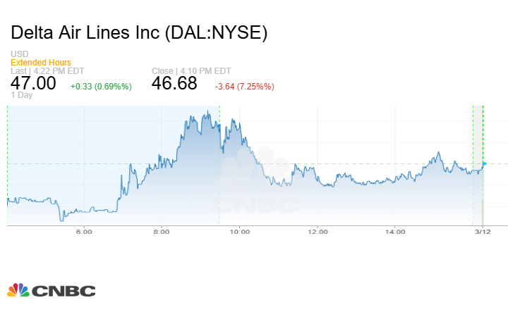 وأضافت شركة Delta Air Lines إلى مخاوف الركود مع خفض توقعات أرباحها بسبب ضعف الطلب الأميركي، مما دفع السهم إلى الانخفاض بأكثر من 7%.