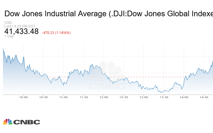 انخفض مؤشر Dow Jones الصناعي 478.23 نقطة أو بنسبة 1.14% عند إغلاق تعاملات الثلاثاء إلى 41433.48 نقطة.