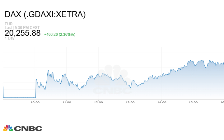 كما أغلق مؤشر DAX الألماني الجلسة على صعود 466.26 نقطة أو بنسبة 2.36% إلى مستوى 20255.88 نقطة.