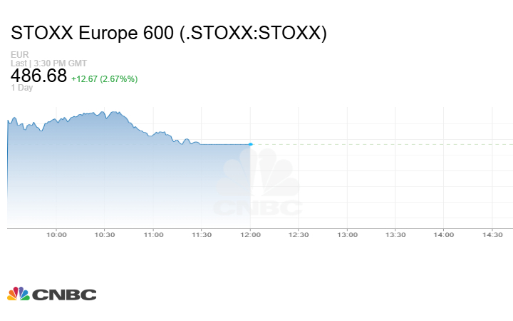 ارتفع مؤشر Stoxx 600 الأوروبي 12.67 نقطة أو بنسبة 2.67% إلى مستوى 486.68 نقطة في نهاية التعاملات. وصعدت أسهم التأمين بنحو 4.17% خلال اليوم، كما زاد قطاع الخدمات المالية بنسبة 2.8%، وقطاع السفر بنسبة 3.6%.