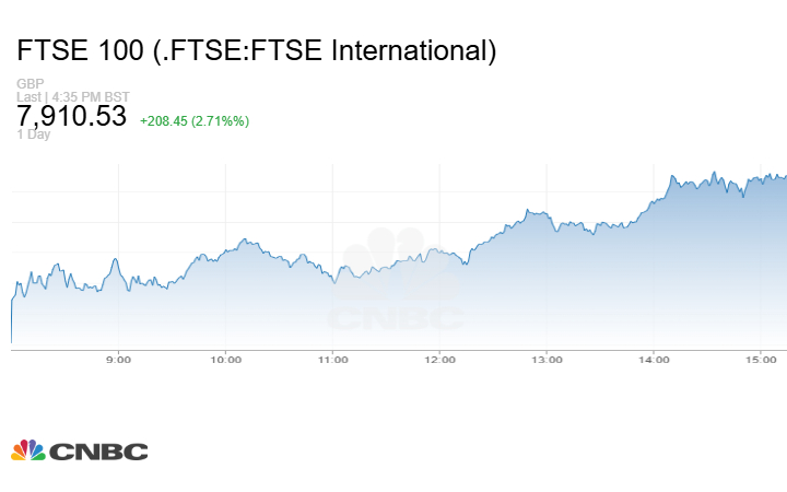 وصعد مؤشر FTSE 100 البريطاني أيضاً 208.45 نقطة أو بنسبة 2.71% عند الإغلاق إلى مستوى 7910.53 نقطة.