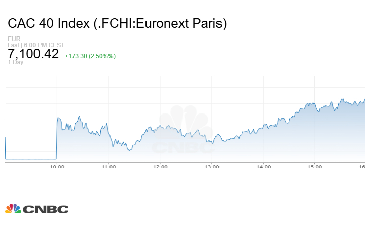 في حين ارتفع مؤشر CAC 40 الفرنسي بنحو 173.30 نقطة أو بنسبة 2.50% عند الإغلاق إلى مستوى 7100.42 نقطة.