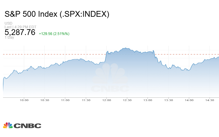 كما أغلق مؤشر S&P 500 التعاملات على صعود 129.56 نقطة أو بنسبة 2.51% إلى 5287.76 نقطة.