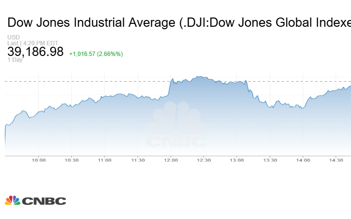ارتفع مؤشر Dow Jones الصناعي 1016.57 نقطة أو بنسبة 2.66% عند إغلاق تعاملات الثلاثاء إلى 39186.98 نقطة.