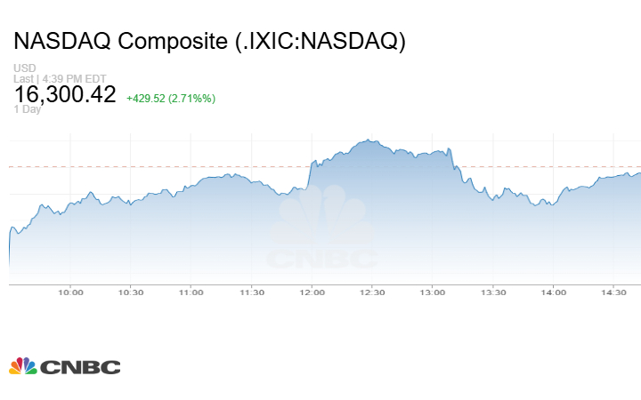 وزاد مؤشر Nasdaq المركب عند الإغلاق بنحو 429.52 نقطة أو بنسبة 2.71% إلى 16300.42 نقطة.