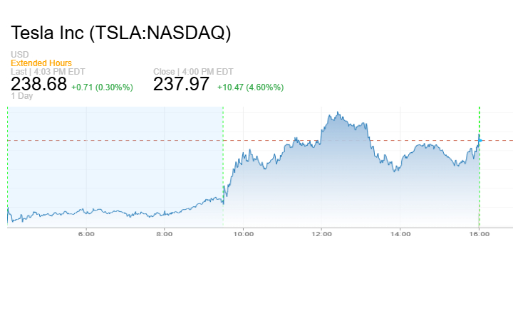 وارتفعت أسهم تسلا Tesla بنسبة 4.6% قبل صدور نتائج أعمال الشركة للربع الأول بعد انتهاء الجلسة.