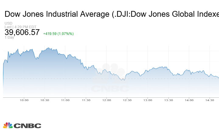 ارتفع مؤشر Dow Jones الصناعي 419.59 نقطة أو بنسبة 1.07% عند إغلاق تعاملات الأربعاء إلى 39606.57 نقطة.