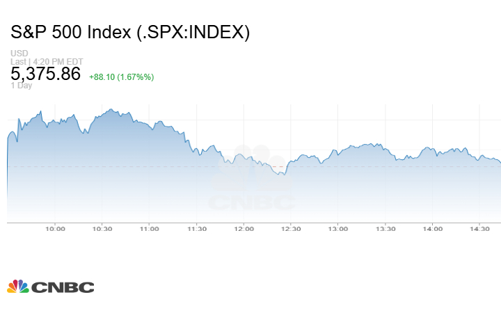 كما أغلق مؤشر S&P 500 التعاملات على صعود 88.10 نقطة أو بنسبة 1.67% إلى 5375.86 نقطة.