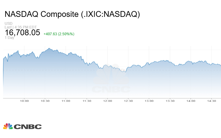 وزاد مؤشر Nasdaq المركب عند الإغلاق بنحو 407.63 نقطة أو بنسبة 2.50% إلى 16708.05 نقطة.