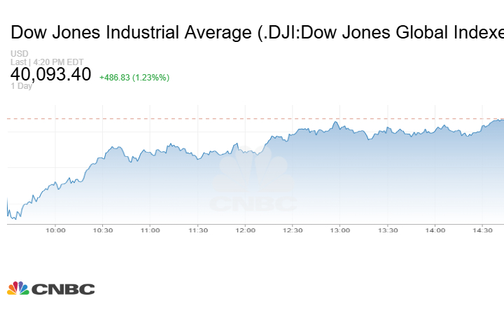 ارتفع مؤشر Dow Jones الصناعي 486.83 نقطة أو بنسبة 1.23% عند إغلاق تعاملات الخميس إلى 40093.40 نقطة.
