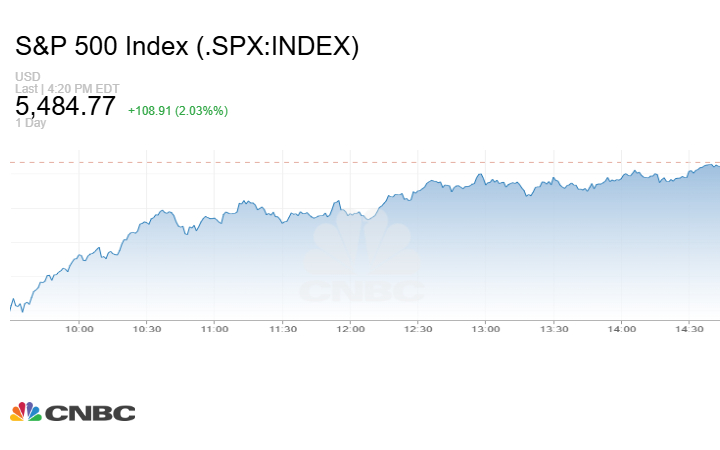 وارتفع مؤشر S&P بنسبة 2%، كما صعد مؤشر Nasdaq المركب بنسبة 2.7%. وزاد مؤشر Dow Jones الصناعي 487 نقطة أو بنسبة 1.2%.