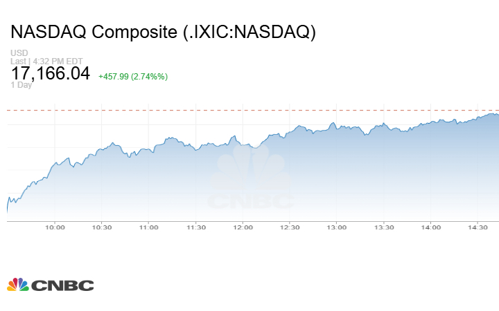 وزاد مؤشر Nasdaq المركب عند الإغلاق بنحو 457.99 نقطة أو بنسبة 2.74% إلى 17166.04 نقطة.