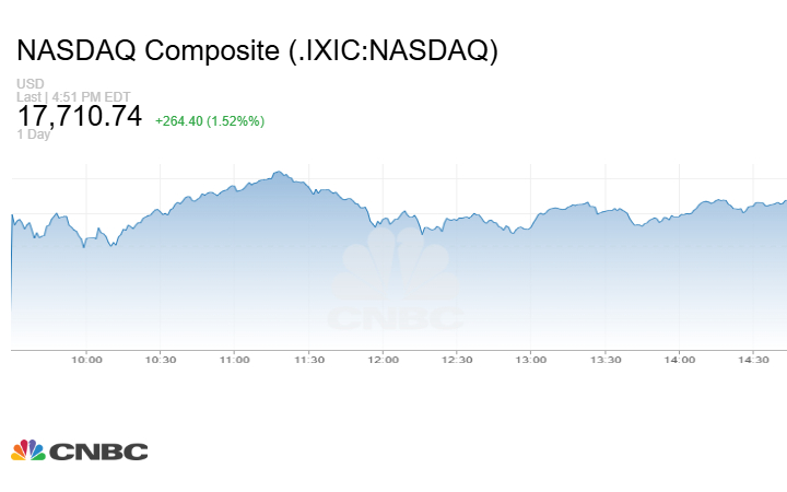 أيضاً قفز مؤشر Nasdaq المركب عند الإغلاق بنحو 264.40 نقطة أو بنسبة 1.52% إلى 17710.74 نقطة.